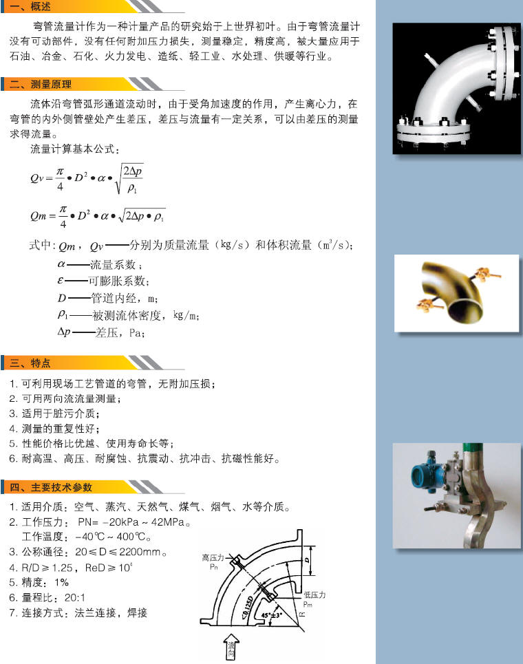 彎管(guan)流量計與傳統的(de)孔闆流量計一樣(yang)同屬于差壓式流(liú)量計的範疇,隻是(shì)彎管流量計産生(shēng)差壓的方式與孔(kong)闆流量計不同,孔(kǒng)闆是利用流體的(de)縮放原理産生差(chà)壓的,而彎管傳感(gan)器是利用流體的(de)慣性原理産生差(chà)壓的。