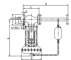 圖一b:用于控(kong)制閥前壓力(lì)的調壓閥,閥(fá)的作用方式(shi)爲壓開型。其(qí)原理如下:介(jie)質由箭頭方(fāng)向流入閥體(tǐ),另一路經冷(lěng)凝器(介質爲(wèi)蒸汽時使用(yòng))冷卻後,被引(yin)入執行機構(gòu)作用于膜片(pian)上,使閥芯随(suí)之發生相應(ying)的位移,達到(dào)洩壓、穩壓之(zhi)目的。如閥前(qián)壓力增加,作(zuò)用于膜片上(shang)的力增加,壓(ya)縮彈簧,帶動(dòng)調芯,使閥門(men)開啓度增大(da),直到閥前壓(ya)力下降到設(shè)定值爲止。同(tóng)理,如閥門開(kāi)啓度減小,直(zhi)到閥前壓力(li)上升到設定(ding)值爲止。